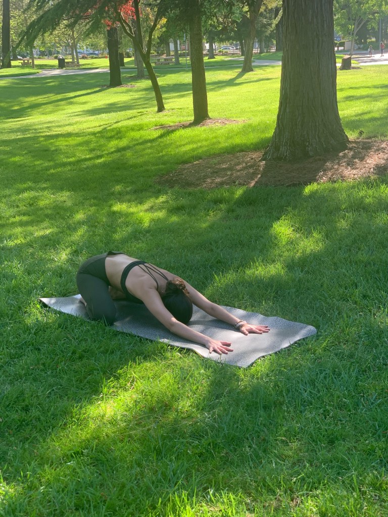 Bring your knees out wide and toes to touch at the back of your mat. Rest your forehead on your mat and reach your fingers to the top of your mat. For a more active child’s pose, life your elbows up.