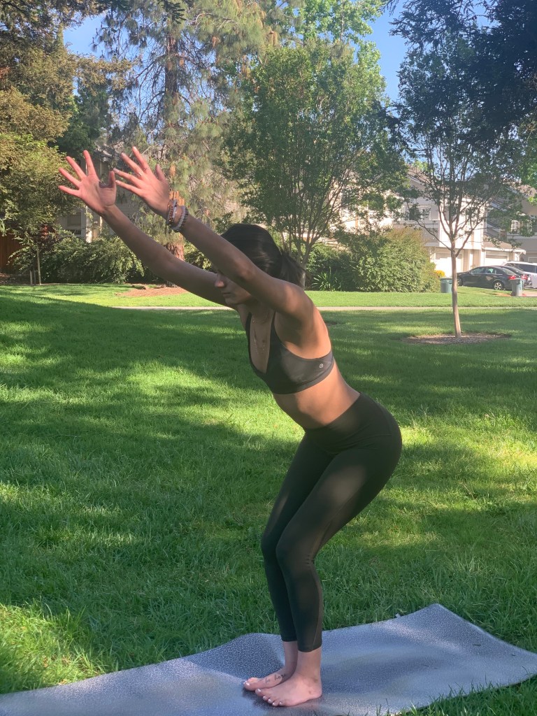 Sit in an imaginary chair by framing your face with both of your arms and draw your shoulders blades down your back. Slightly point your pinky fingers towards one another. Send your hips back and then down. Ensure that you can see all ten toes if you gaze down. Keep your gaze straight in front of you.