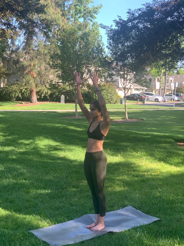 Stand tall — root down to rise up. Frame your face with both of your arms and draw your shoulders blades down your back. Slightly point your pinky fingers towards one another. Keep your core locked by engaging it and bringing your belly button towards your spine. Keep your thighs lifted off your knees by squeezing them up and together, along with your glutes. Keep equal weight in both feet.